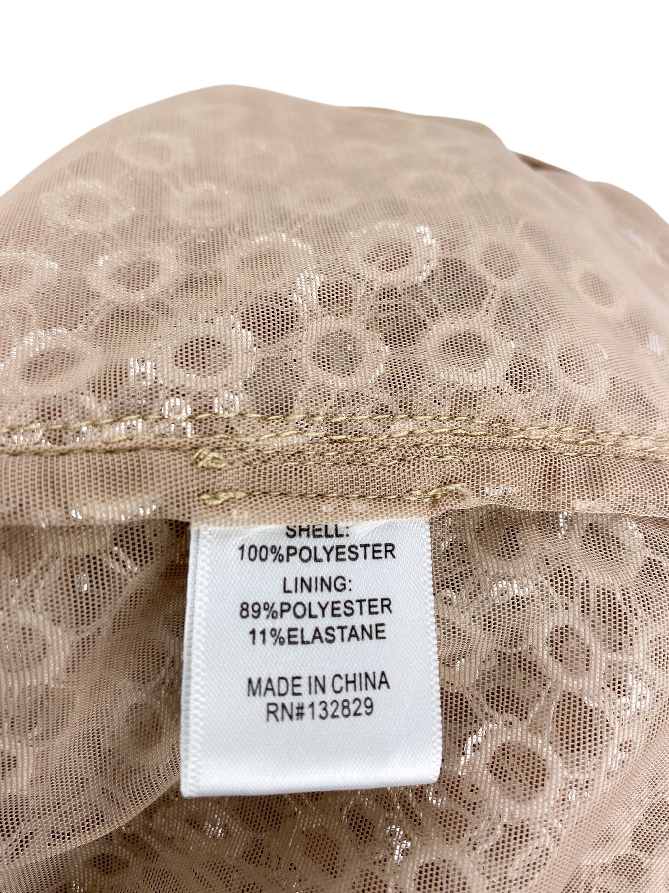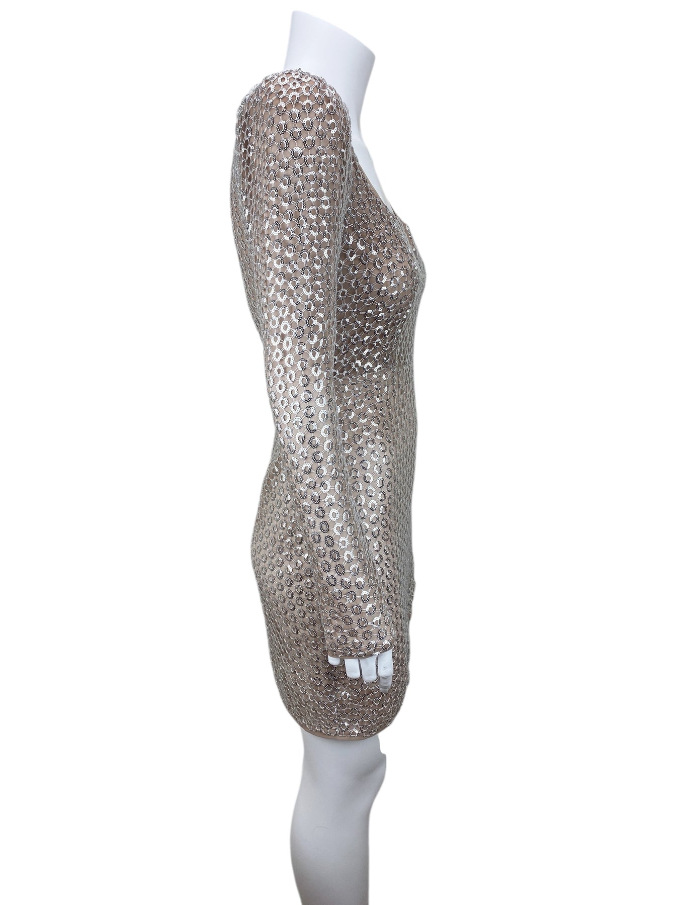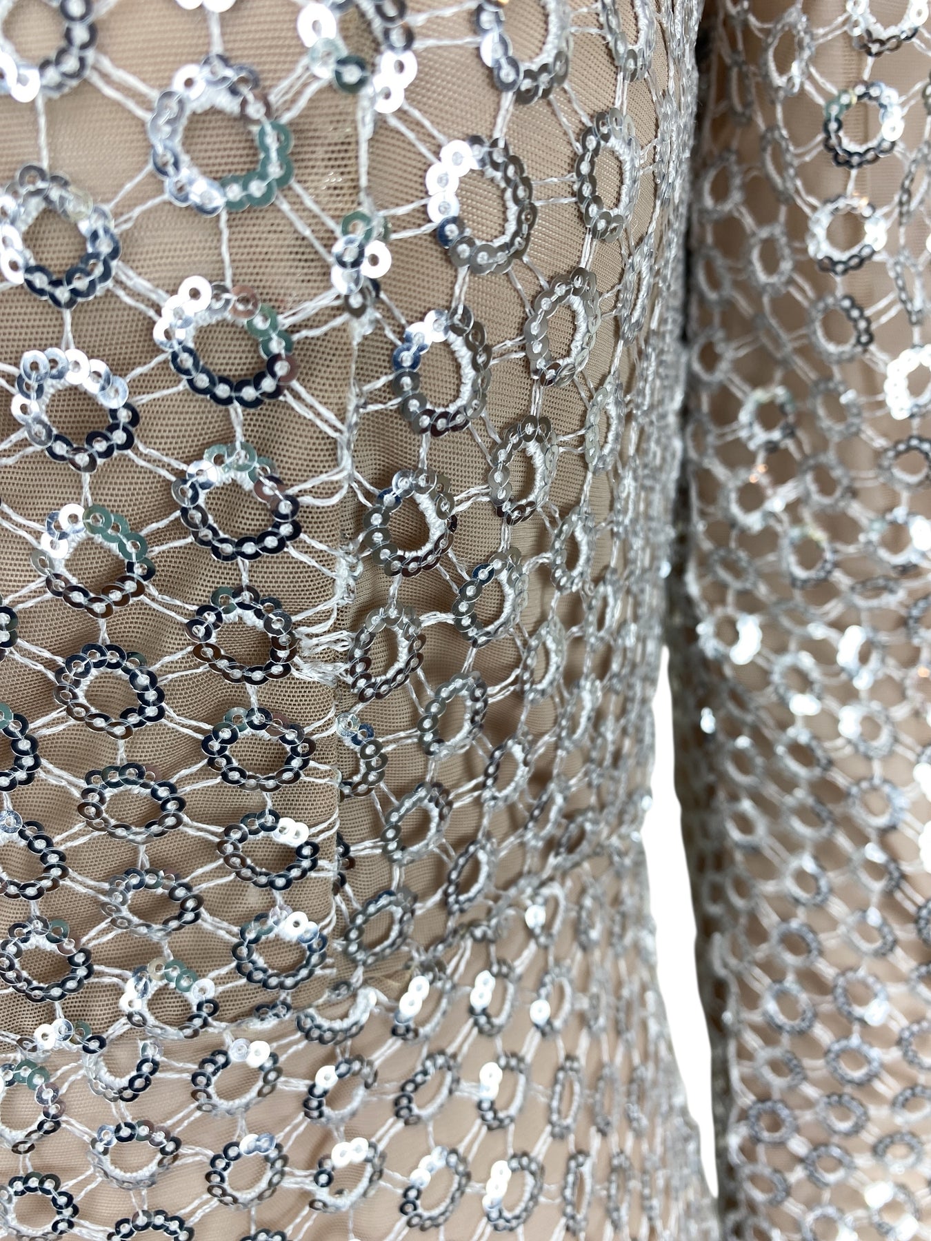 -A head-turning party dress crafted with a layer of silver sequins sewn together in circles over sheer nude poly mesh