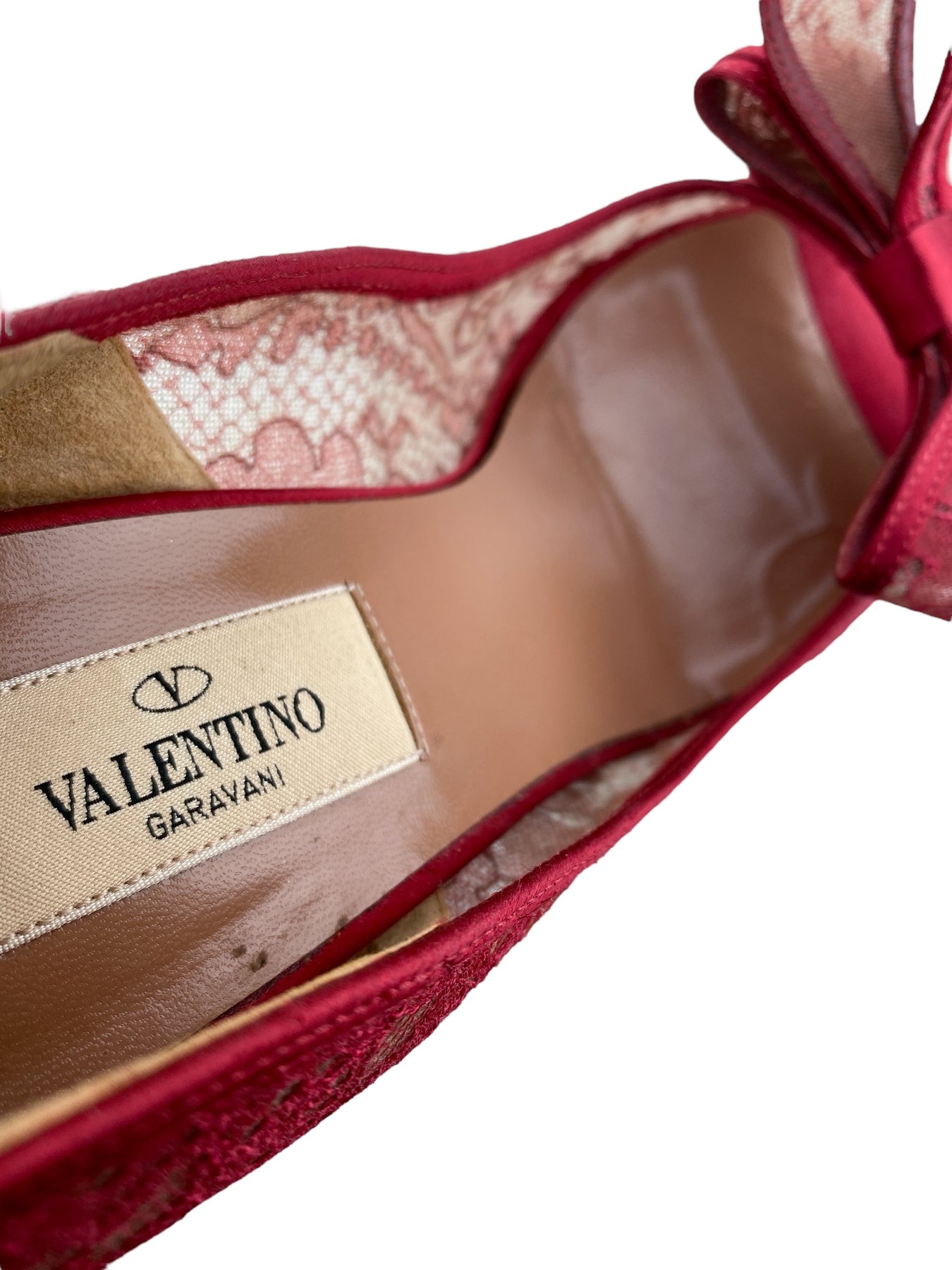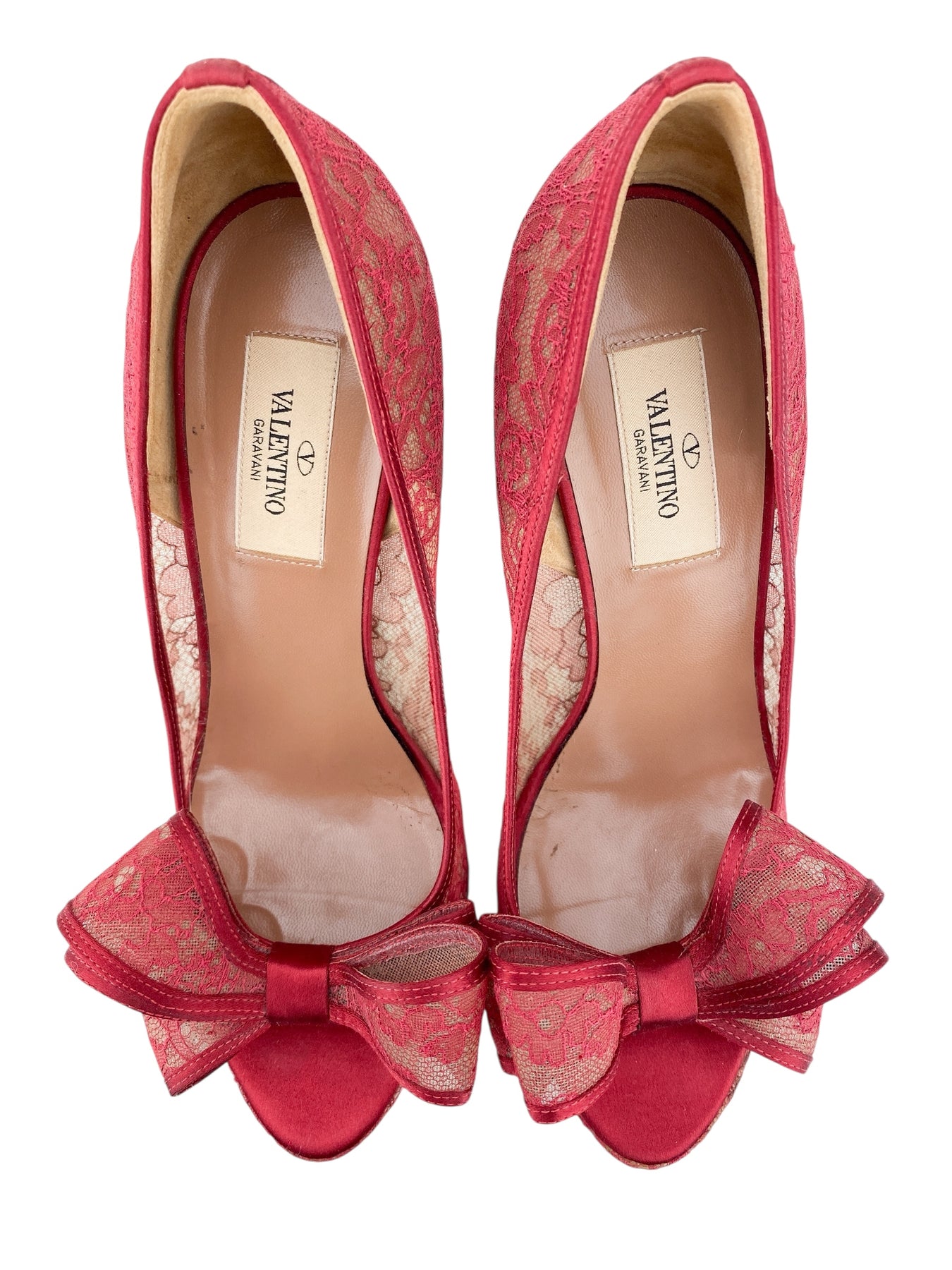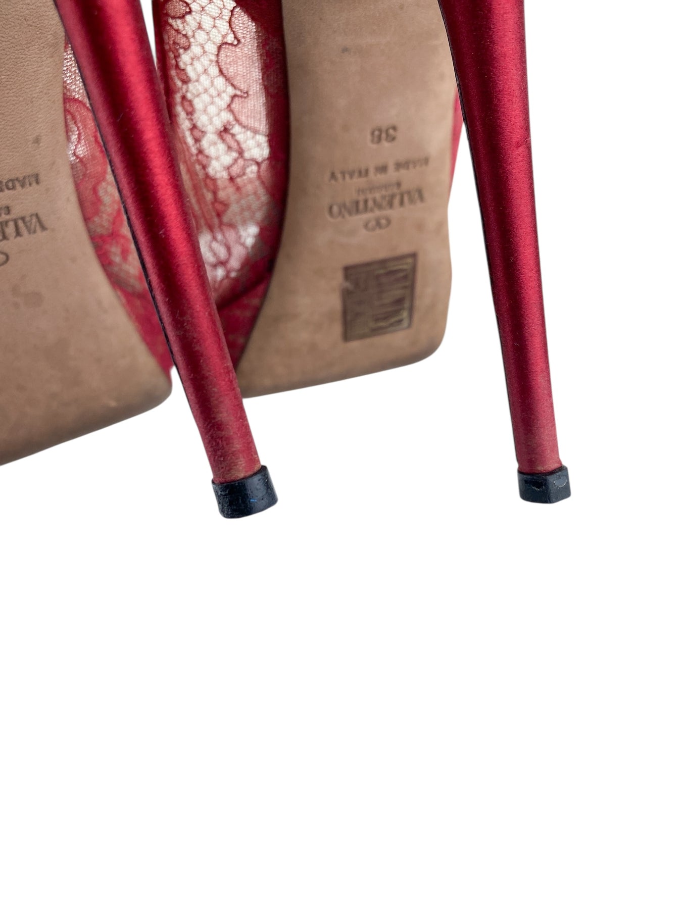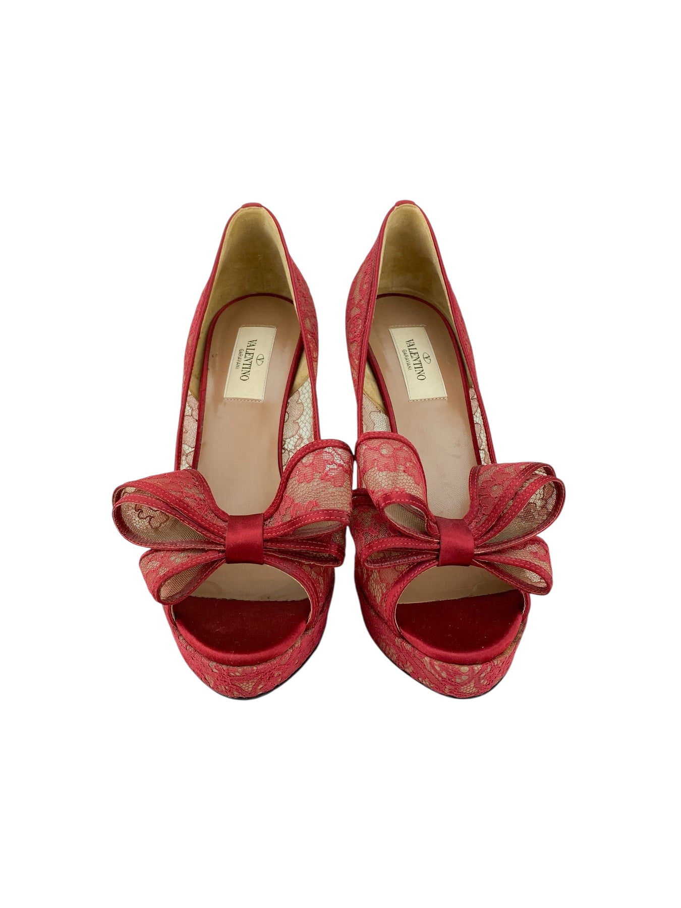Valentino Garavani Women's Satin Lace Peep Toe Platform Pumps Red Size 38 (8)