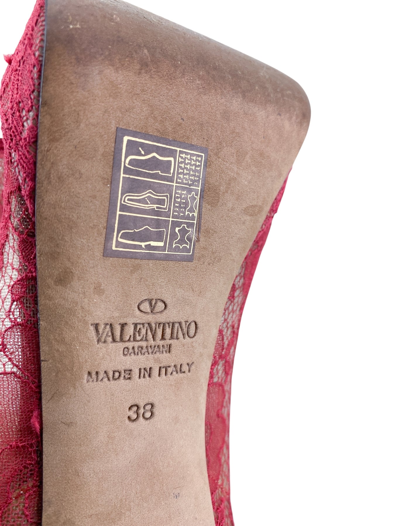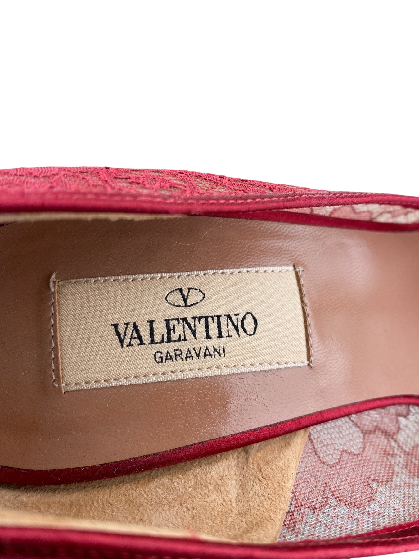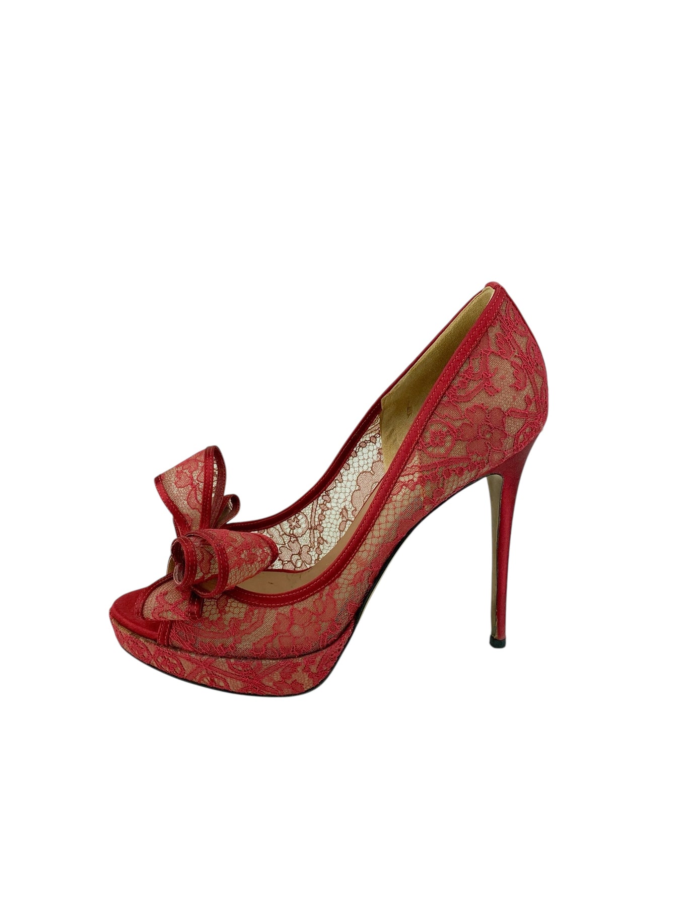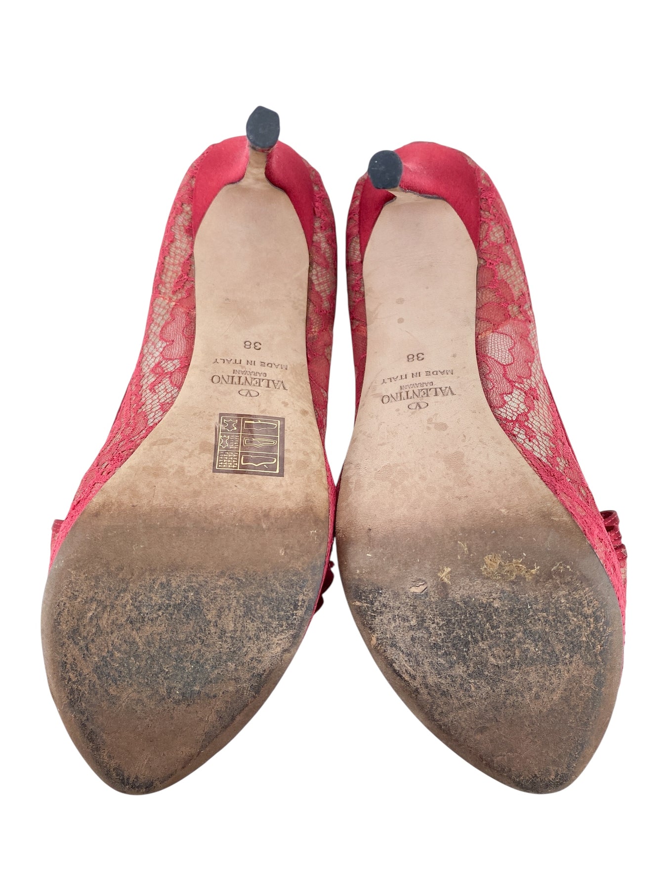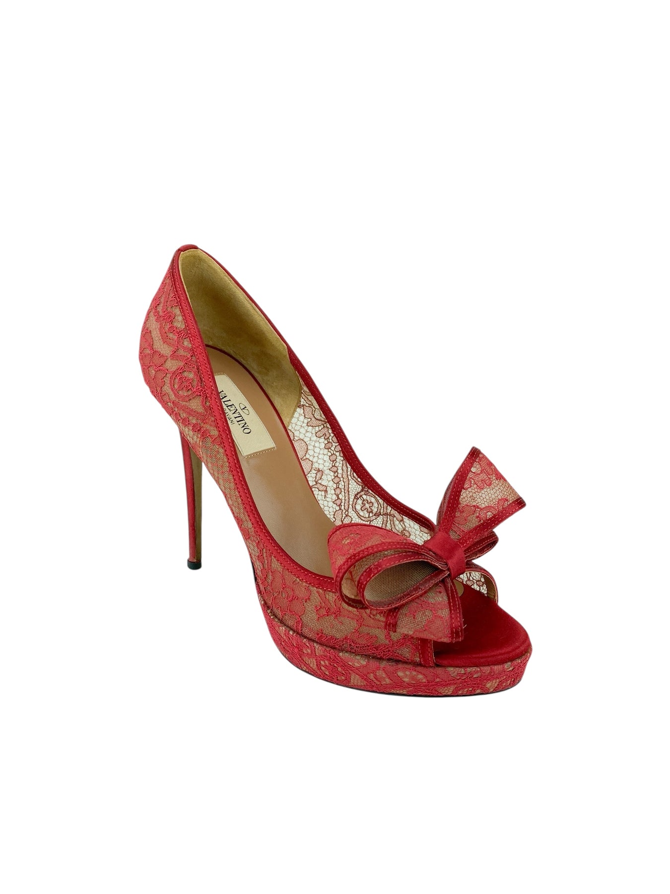 Valentino Garavani Women's Satin Lace Peep Toe Platform Pumps Red Size 38 (8)