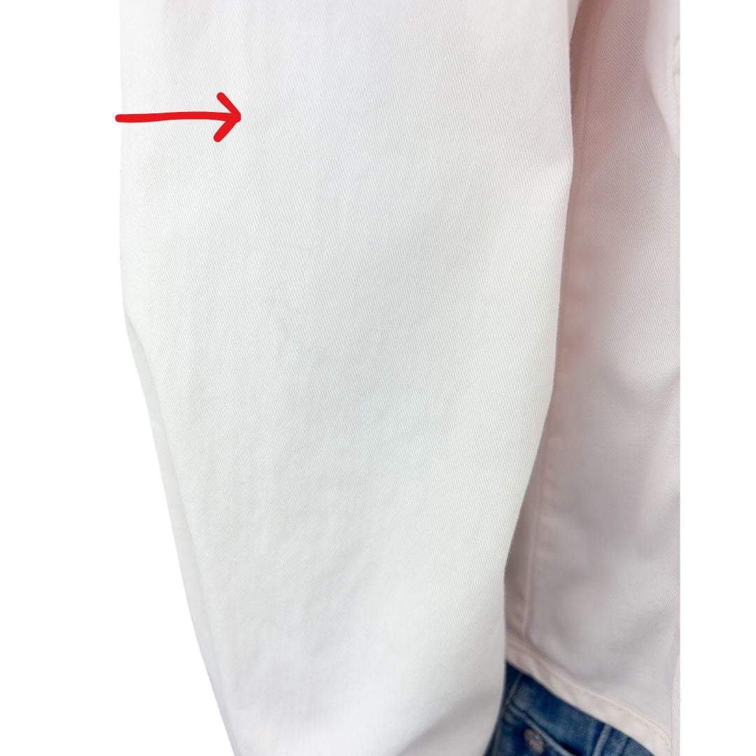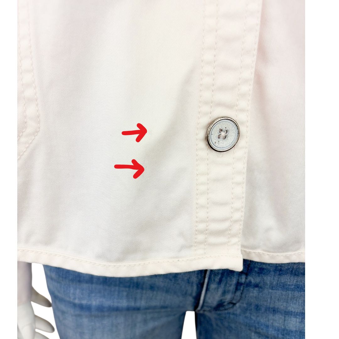 Good. Very faint spots at lower front (photo #7) and at front right sleeve (photo #8). Difficult to see, especially with shadows in photo #7).***Runs big, please check measurements***