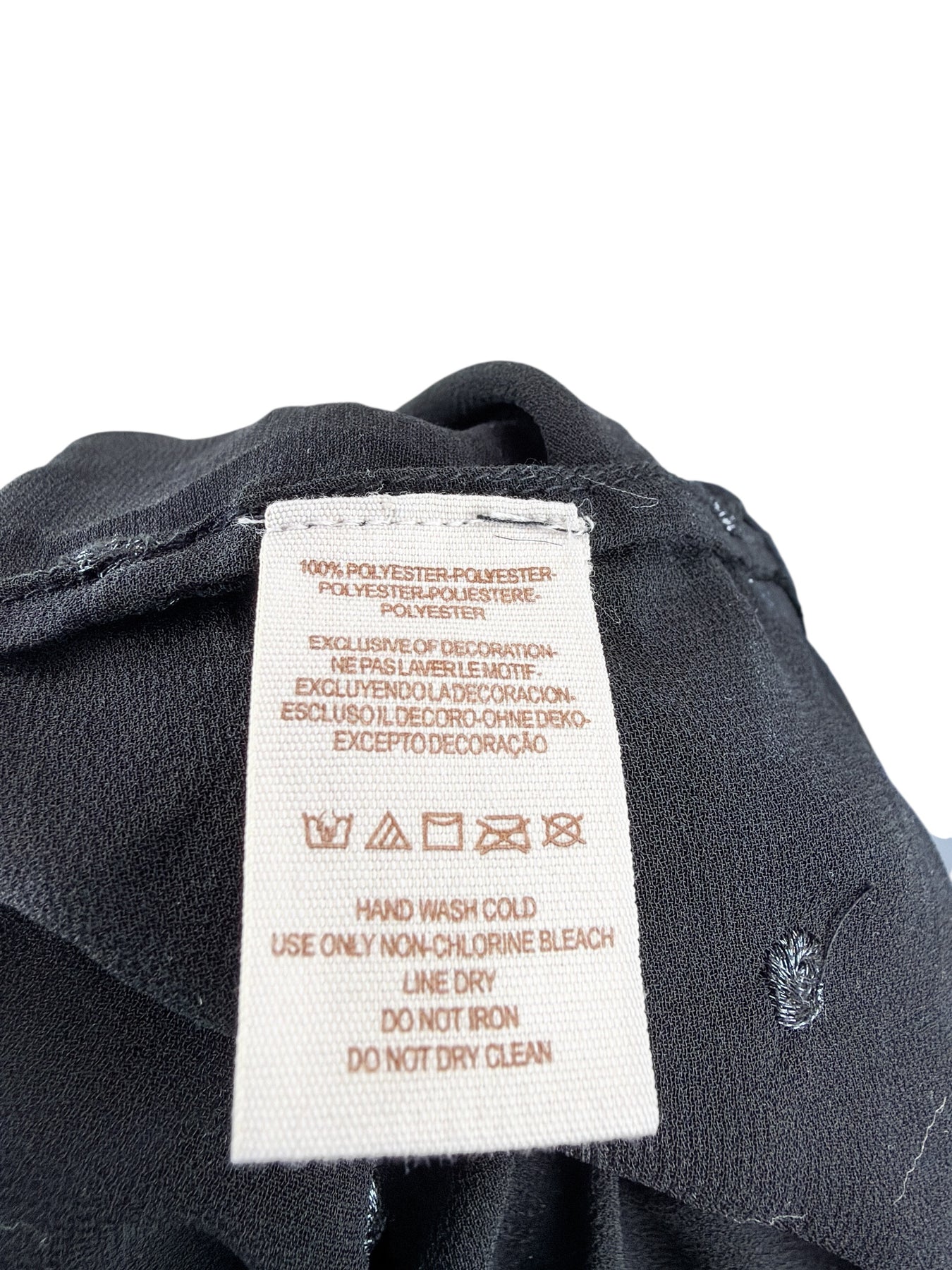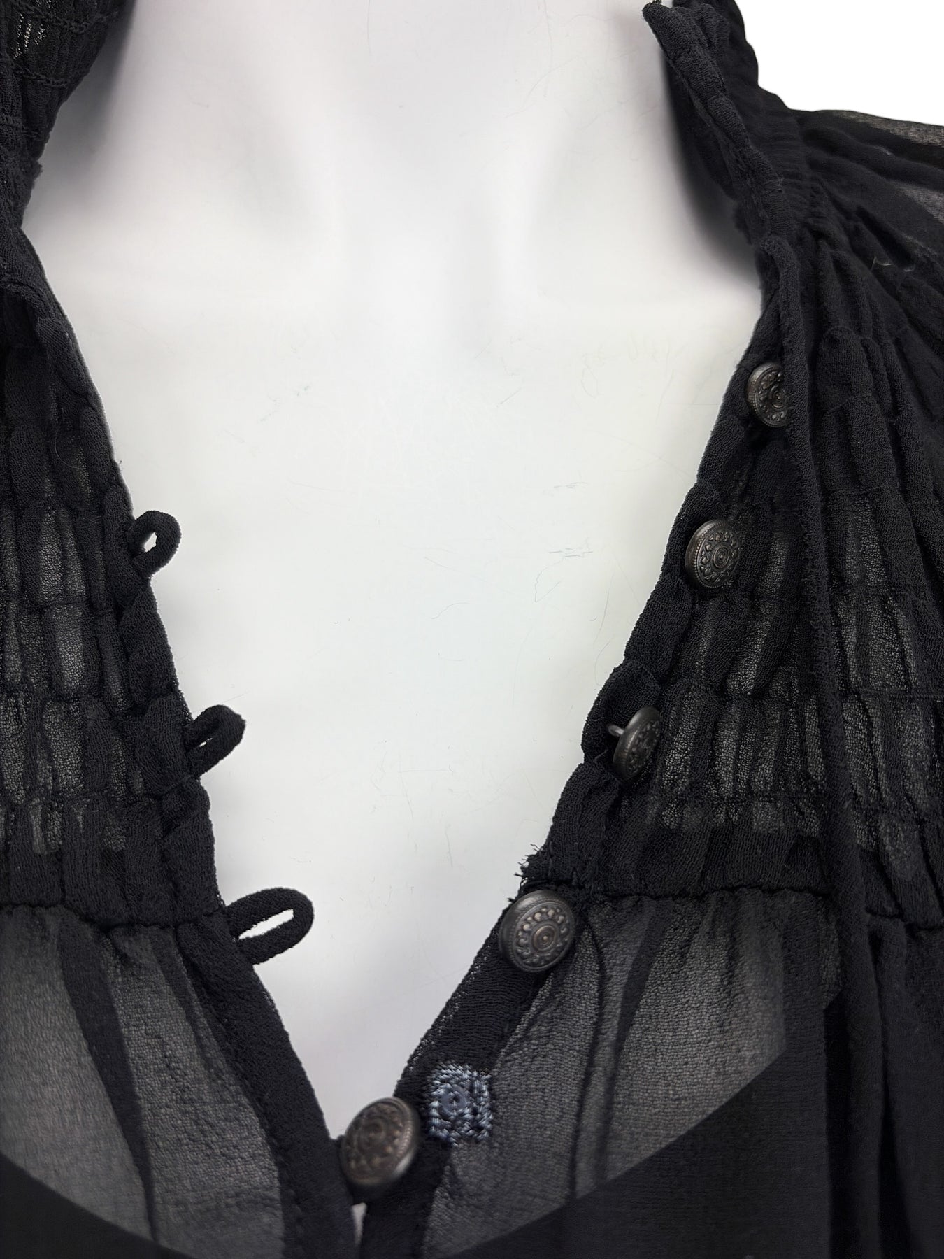 Very Good. A few sequins are missing from the embroidery, but this is difficult to notice unless looking very closely (photo #9 - lowest embroidered dot is missing a sequin). Due to the nature of georgette and the embroidery there may be a loose thread or two that can be clipped.