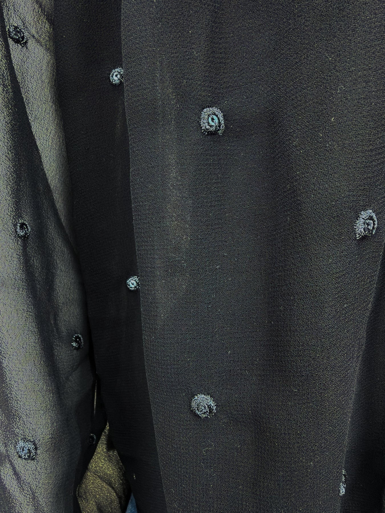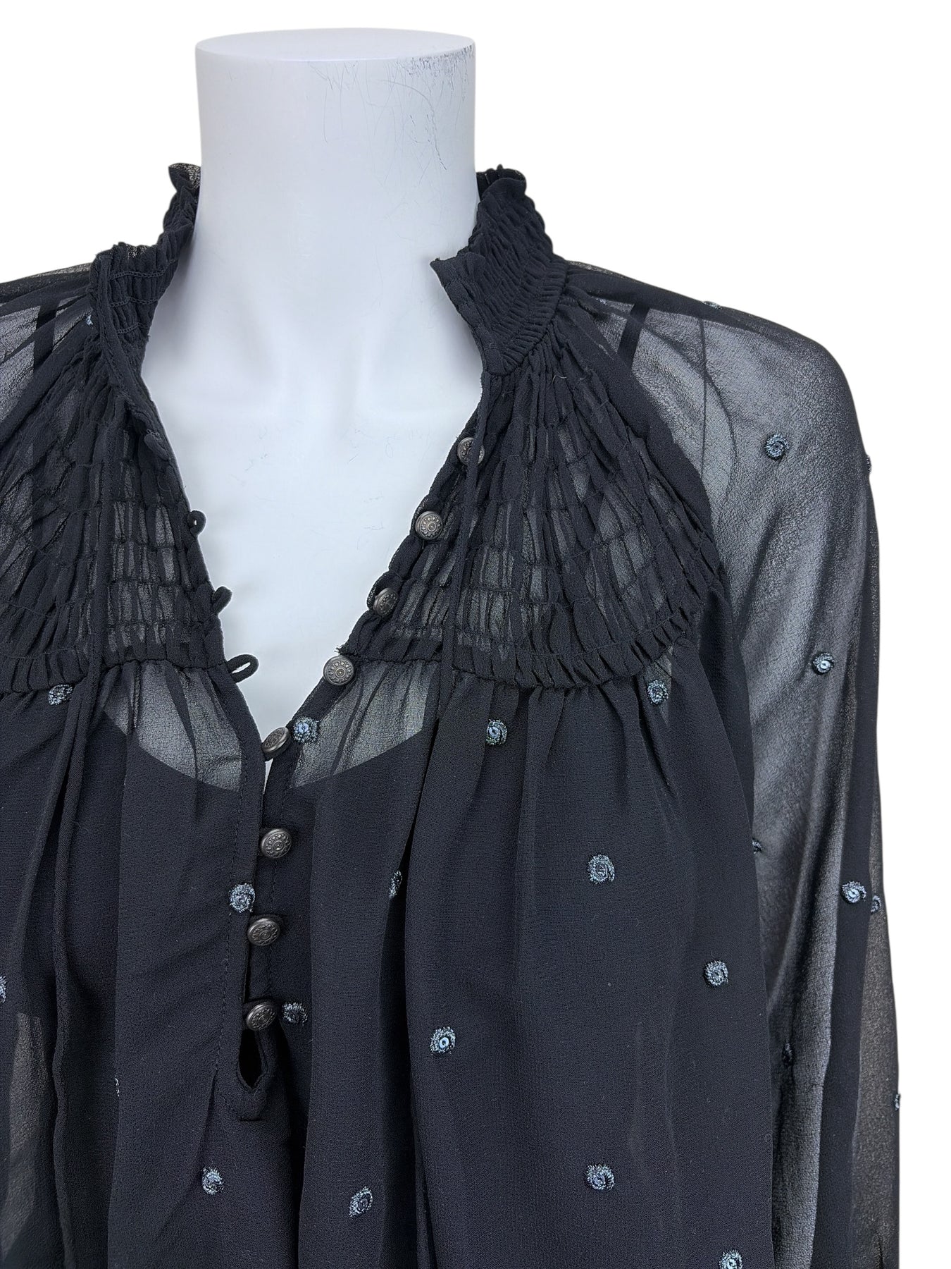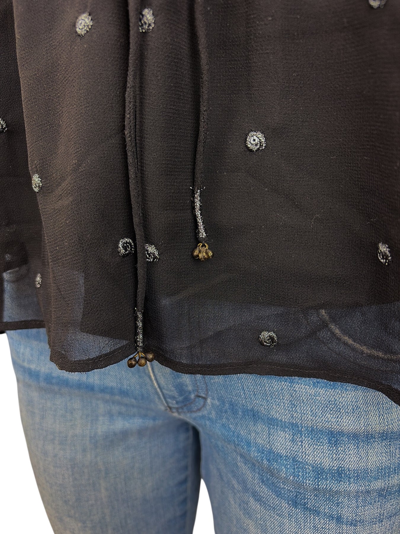 -A lovely top crafted in sheer polyester georgette and adorned with silvery metallic embroidered dots with sequins