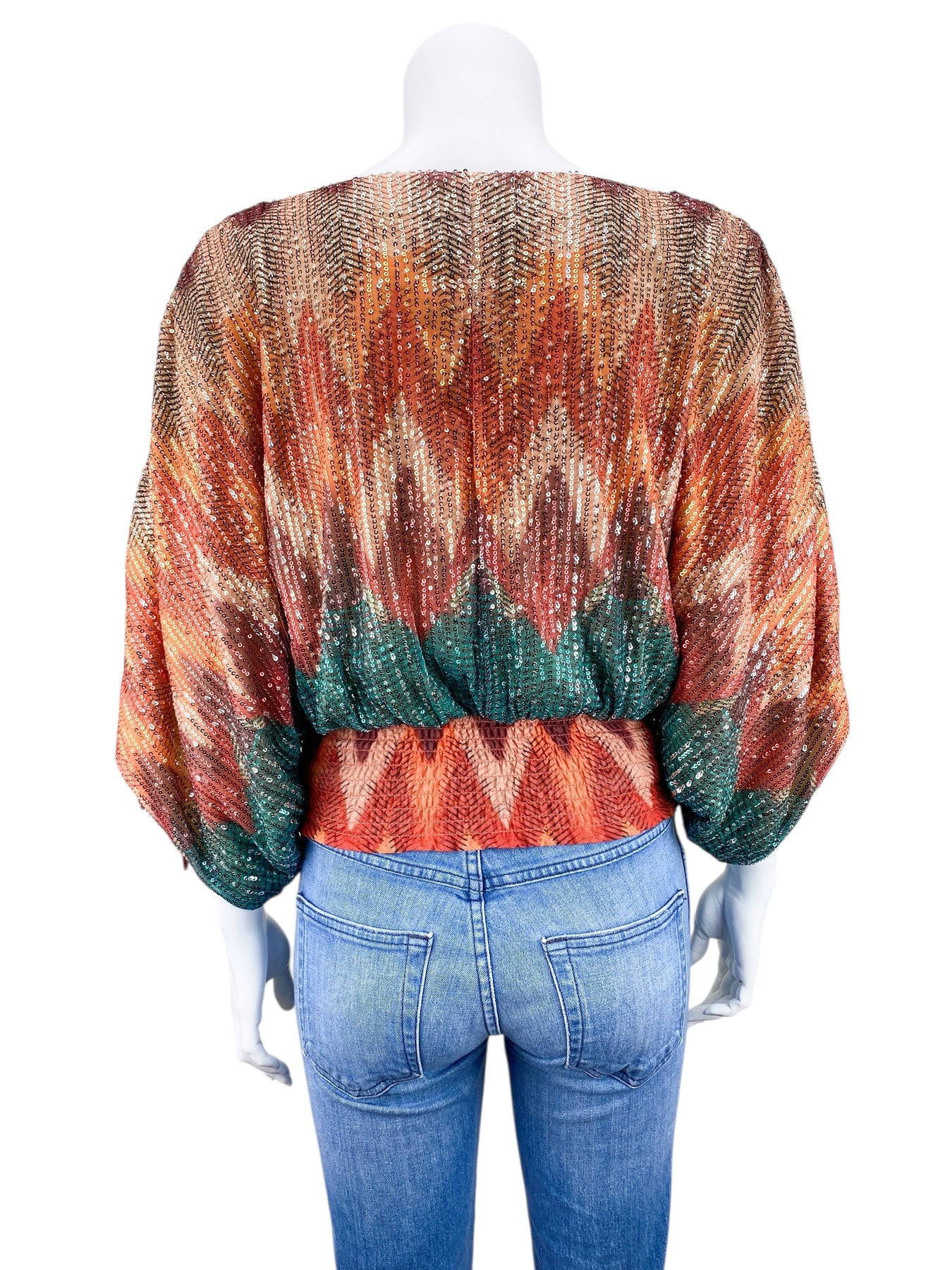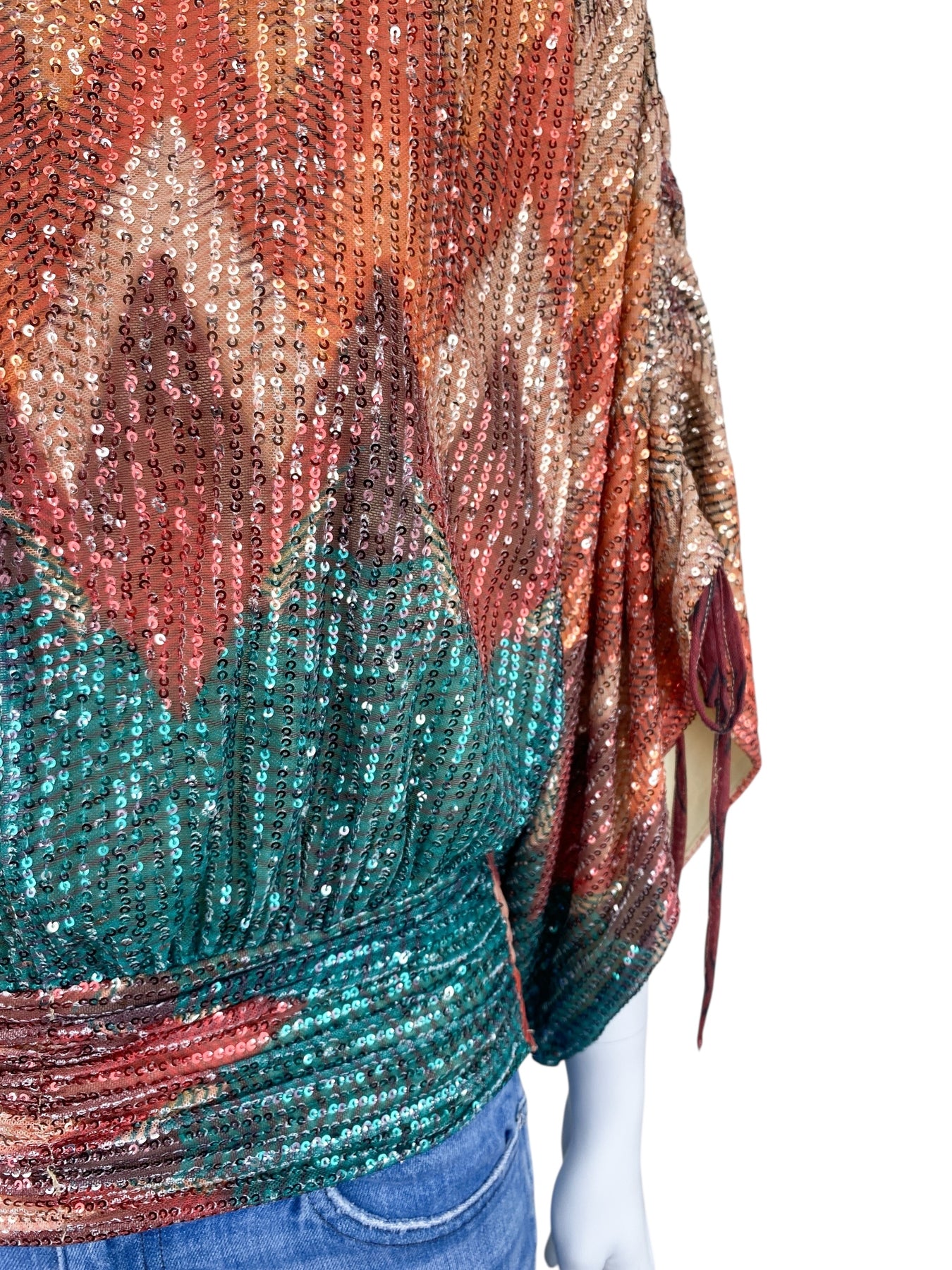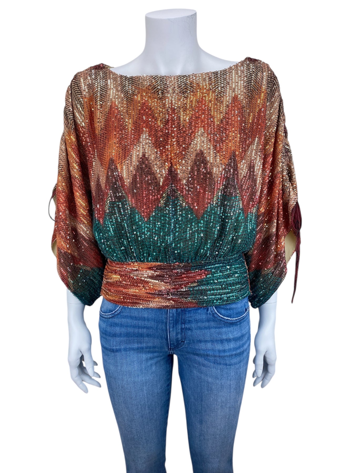 -Ramy Brook Women's Zig-Zag Sequin Dolman Party Top Burnt Orange/Jade Size S