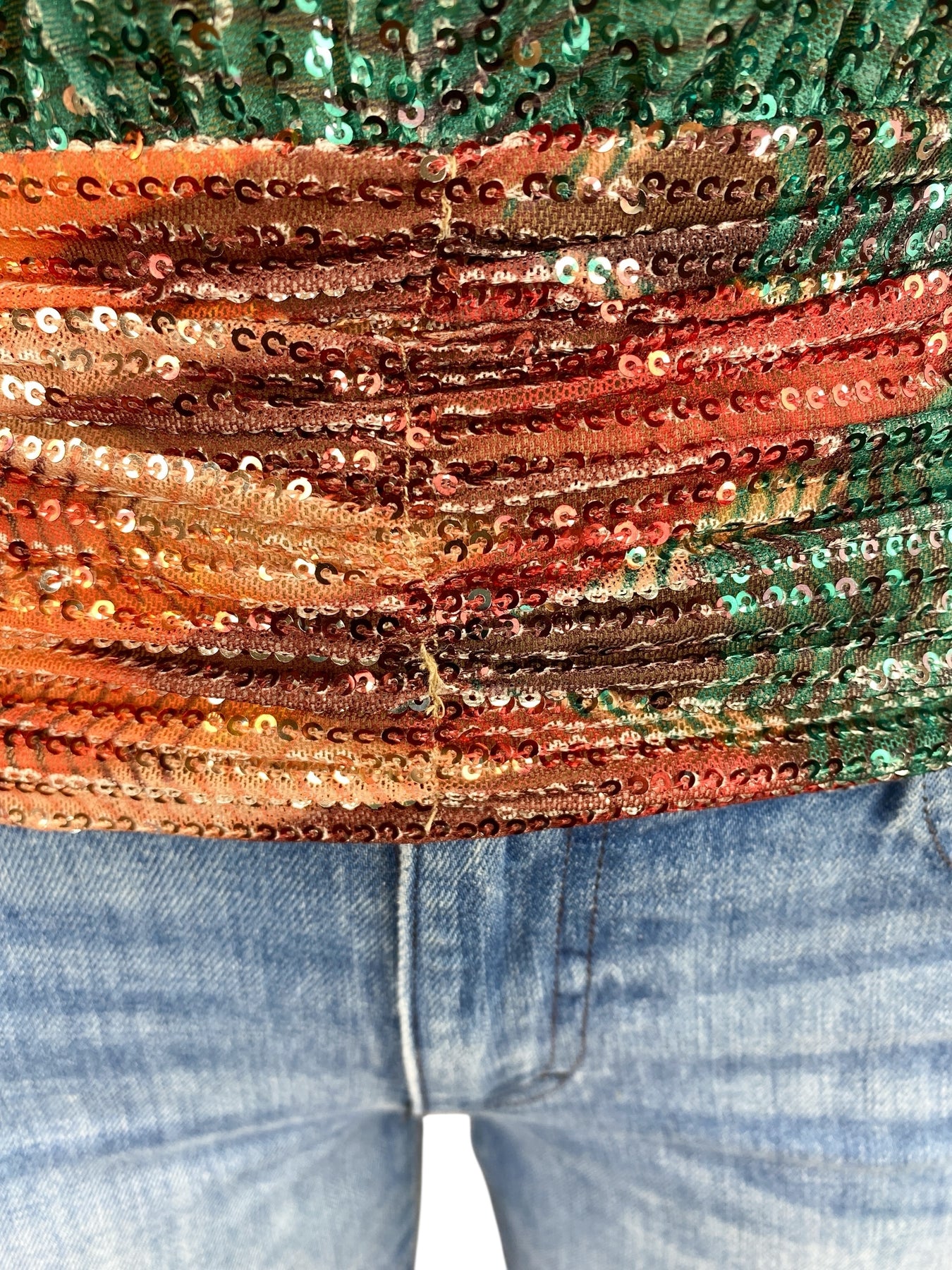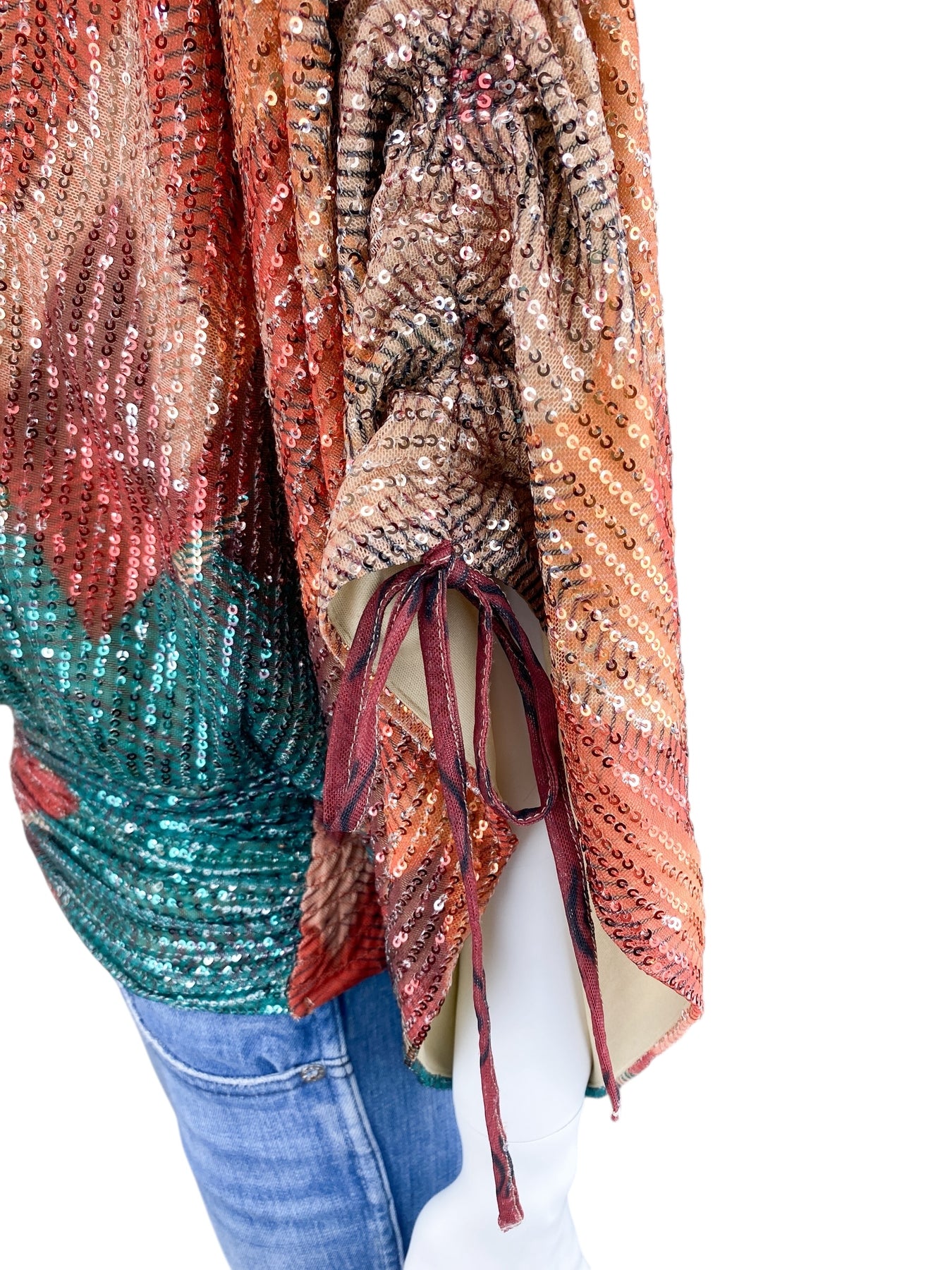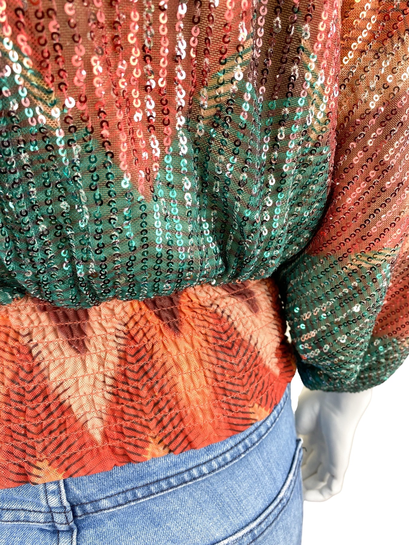 -Ramy Brook Women's Zig-Zag Sequin Dolman Party Top Burnt Orange/Jade Size S