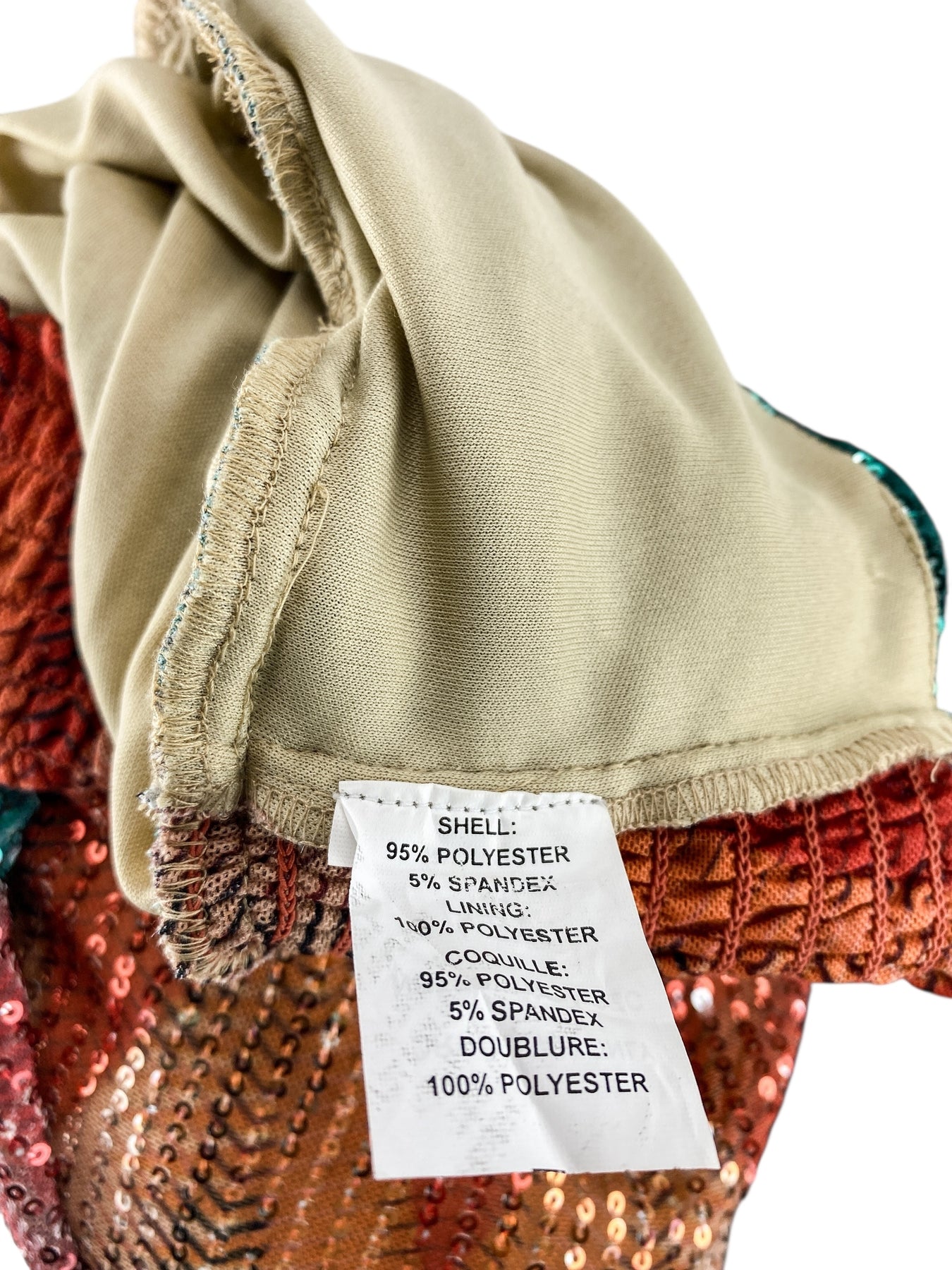 Very Good. There might be a missing sequin or two, but this would be difficult to find or notice with so many sequins. There is a bit of extra stitching at the center-front waist (photo #10). Missing stitches on inside seam allowance (photo #11).